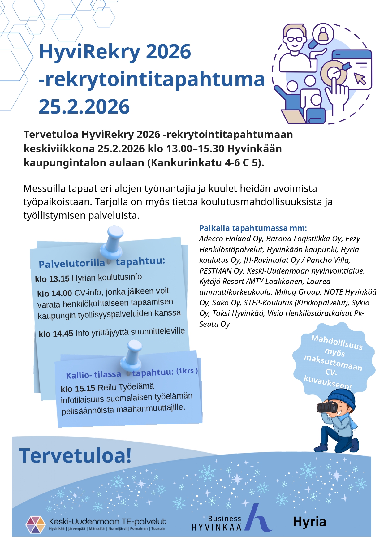 Takaisin listaukseenKuunteleHyviRekry 2026 – rekrytointitapahtuma Hyvinkäällä 25.2.202610.02.2026—Työnhakijat Jaa juttu: